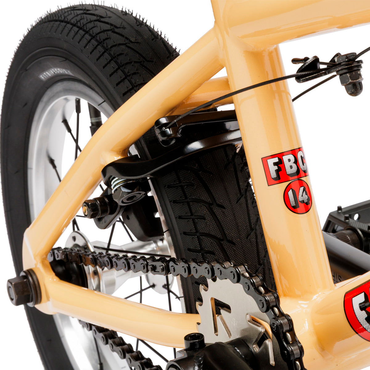 "For 2026 we’ve lightened up the 14” frame and fork and increased the crank length from 95mm to 105mm. Making our MISFIT bikes properly proportioned for young riders has been a goal of ours for years and although they’re not obvious at first glance, little details like the crank length and 23/9 gear ratio make a big difference for riders. Small diameter handle grips and a short reach brake lever help keep young riders in control. Low tension U-brake springs and a linear brake cable make slowing down easier while a longer 200mm seat post for 2026 allows for more adjustability. We have also switched from 19mm rear axle nuts to 17mm to allow riders to use smaller diameter pegs. A lot of small details making for one big improvement.".