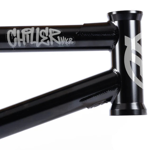 "After the success of the original DUB collab, a decade later we bring you the Chiller MK2 with updated geometry and updated features. This has been designed with the DUB crew to be what they feel the perfect street frame should be for the current era of street riding. This frame uses our latest ICS2 wishbone and features a custom DUB frame badge on the seat stay bridge. The frame is made using 4130 Chromoly with heat treated head tube, BB and dropouts.".